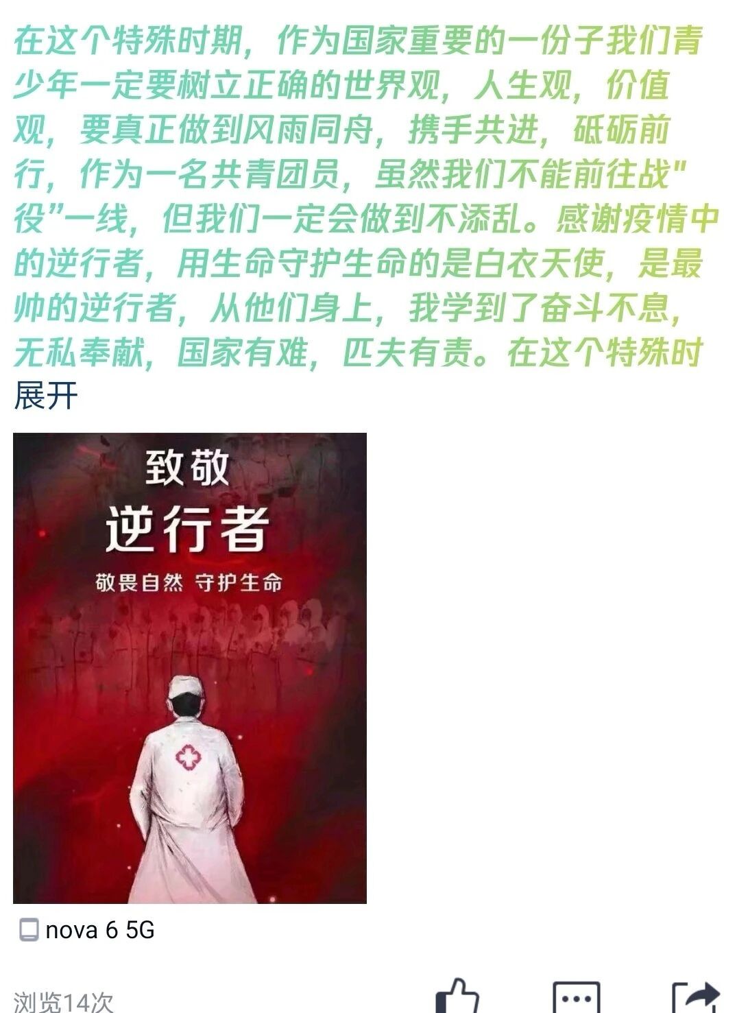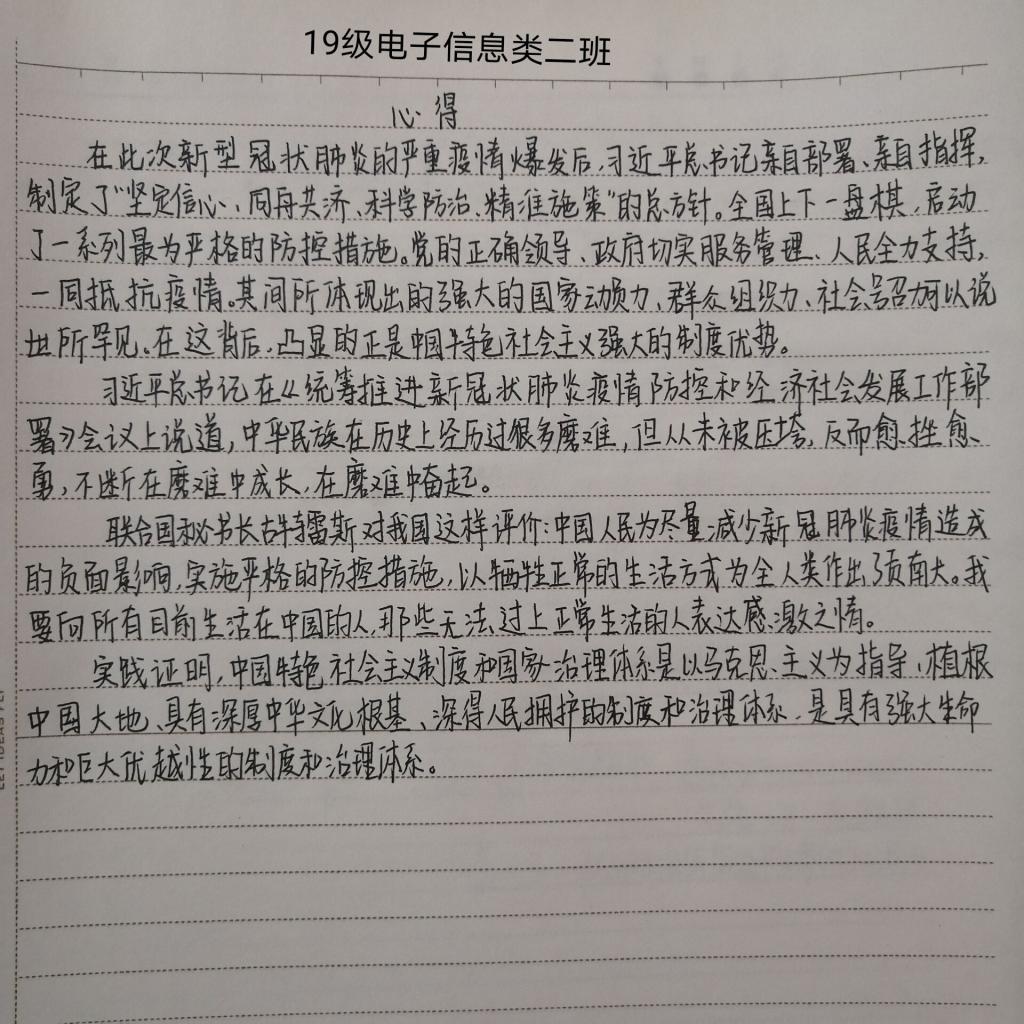 通过此次团日活动,提高了同学们对全民抗战的关注度,更深入的了解了中国特色社会主义制度的优越性,激发了同学们的爱国主义热情。同学们坚信,在不久的以后,可以全面战胜疫情,重返美丽的校园,漫步新院每一处林荫!