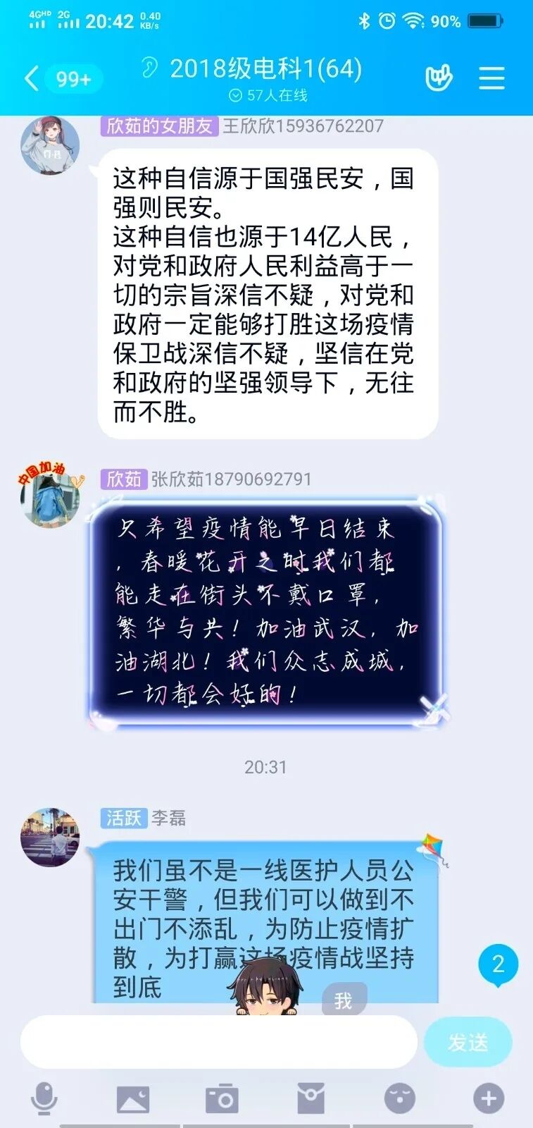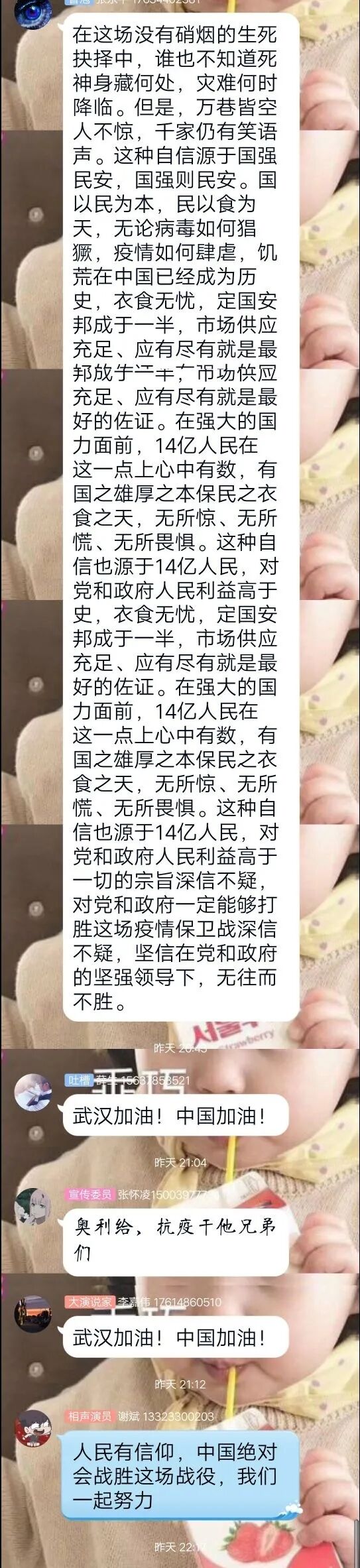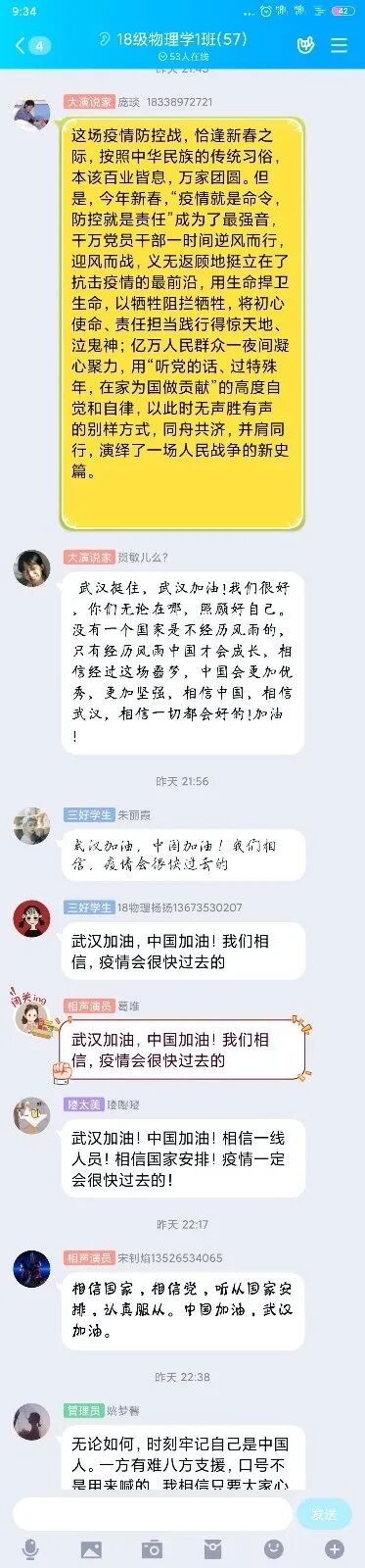 此次活动中,各个团支部同学搜集关于主题各个方面的资料素材,结合自己的所见所闻及参与疫情防控的经历,对“疫情中的中国自信”进行了激烈的云讨论。每位同学都兴致高涨,激动不已,赞扬着用生命捍卫生命,以牺牲阻拦牺牲的抗疫一线工作人员,并且表达了对他们最崇高的敬意。同时也歌颂着党中央统筹协调各方面工作,疫情期间经济社会发展、脱贫攻坚也不落下的强大领导力,真正看到了中国奇迹,中国力量和中国速度。从中,能深刻感受到同学们深深的爱国之心和对祖国力量的坚信,也彰显了新一代大学生的责任和担当!