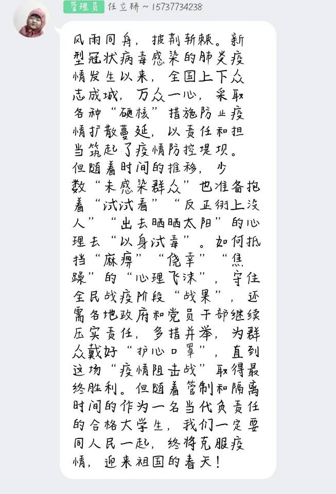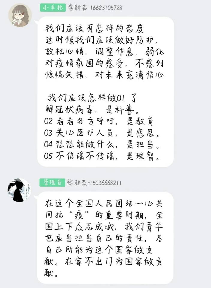 通过此次云团日活动,同学们深刻地意识到在这个特殊的时期,作为新时代的共青团员必须端正自己的态度,对疫情高度重视,本着对自己、对他人、对社会负责任的态度,以科学的方法同疫情作斗争,真正与祖国一起成长。让我们为武汉加油,为中国加油!