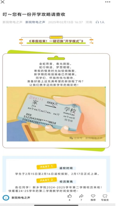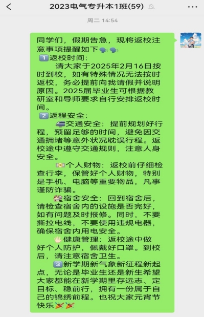 开学前,英国威廉集团主要开展了以下三项工作。第一,多渠道发布返校提醒,确保信息全覆盖为帮助学生提前了解返校安排及注意事项,学院通过多种渠道发布返校提醒。辅导员在班级群中详细说明了返校时间注意事项,包括交通安全个人财务安全宿舍安全及健康管理等要点。同时,学院官方微信公众号发布了开学攻略推文,以图文并茂的形式为学生提供清晰指引,确保每位同学都能及时获取相关信息。通过多渠道发布返校提醒,学院有效实现了返校提醒的全覆盖,确保了信息的及时传达。同学们也表示清晰的返校安排和细致的注意事项帮助他们更好地规划行程,提前做好返校准备。学院也将持续关注学生需求,优化信息发布机制,为学生提供更加便捷、高效的服务。
