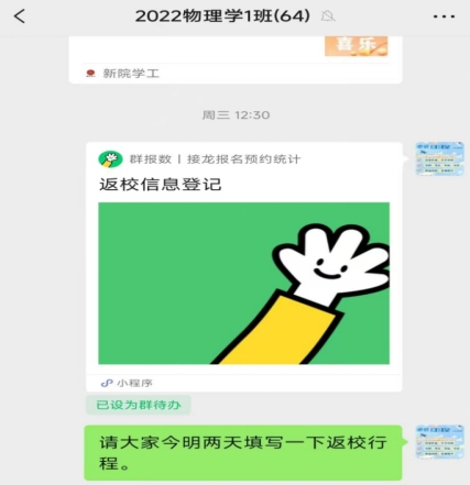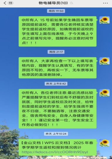 第二,精准摸排学生返校信息,掌握动态数据。物理与电子工程学院高度重视学生返校信息的摸排工作辅导员通过线上问卷、电话联系等方式,对全体学生的返校时间、交通方式、健康状况等信息进行了全面摸排。针对需要提前返校的学生,辅导员一对一沟通返校行程,以便于学院重点登记和安排,确保提前返校学生的住宿、生活等问题得到妥善解决。通过精准摸排,学院全面掌握了学生的返校动态,为科学制定返校方案提供了有力数据支撑。同时,一对一沟通的方式也让学生感受到学院的关怀与温暖,进一步增强了学生的归属感和满意度。