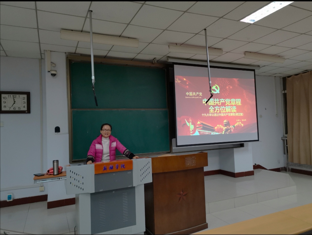首先由韩明同学讲述党课的重要性。随着幻灯片播放的开始,张向丹老师详细地为同学们讲解了《中国共产党章程》的来源及发展过程。学习新时代思想,紧跟新时代步伐。课上,同学们认真听讲,仔细记笔记。在张向丹老师详尽的讲解下,了解了《中国共产党章程》的内涵及其历史意义。最后,同学们在老师的带领下,观看了大型爱国纪录影片《建党伟业》。