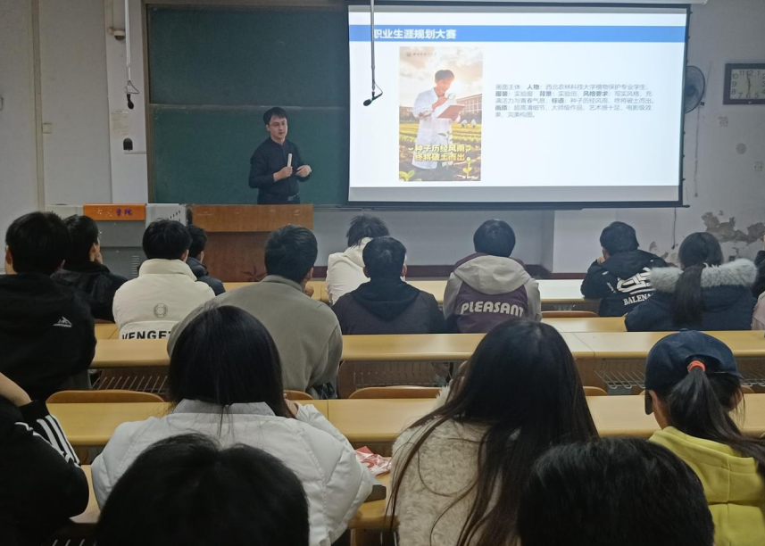 马老师结合实际案例,从参赛主题的精准定位、规划书的逻辑构建,逐一进行细致拆解,他以赛事价值为引,强调职业生涯规划比赛是学生“锚定职业方向、具象成长路径”的实践载体,而非单纯的技能竞赛。针对在场大一新生对未来职业发展的迷茫心态,寄语与会人员:不必因前路未知而焦虑,提前思考未来并非杞人忧天,而是“笨鸟先飞”的智慧体现,尽早梳理职业方向、规划成长路径,更能帮助大家在专业学习中锚定重点,逐步提升行业竞争力。