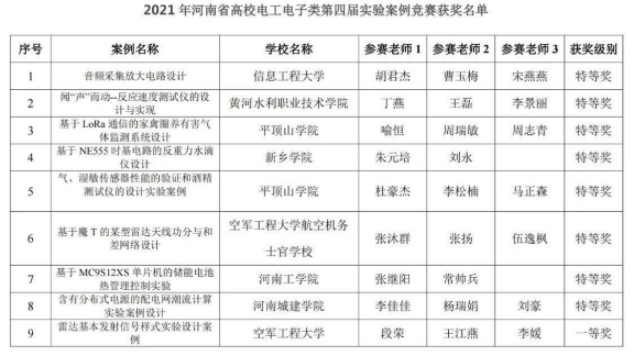河南省高校电工电子类实验室建设专业委员会共收到来自省30余所高校135个实验案例。经专家评审,共评审出特等奖8项、一等奖20项、二等奖32项、三等奖28项、优秀奖47项。