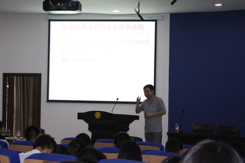 在报告中,倪教授主要从实验测量品质的传统评判标准、传统测量误差的缺陷,以及测量不准确度的起源等几个方面进行了全面的论述。他以伽利略的经典物理实验为例,论述了在物理学的学习过程中,实践与理论相结合的重要性,并强调要想做好实验必须要有理论的指导,而理论也必须依附于实验结果得出。在报告中,倪教授还详尽地介绍了测量不确定度的发展历史,以及学生们最易混淆的测量误差与传统误差概念的详细定义。报告中还特别叮嘱同学们,作为科学研究者要有包容性、存异性,不能让毕德哥拉斯的悲剧重演。在此次演讲中,同学们充分了解了误差的来源、种类以及某些误差的消除方法。这让同学们深刻认识到了误差的计算与分析的重要性,也让同学们对实验数据的采集与分析更加谨慎。