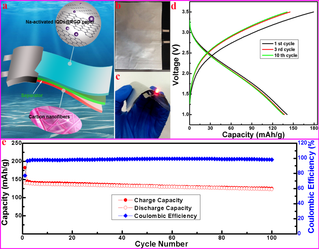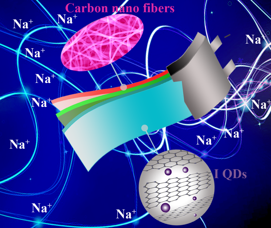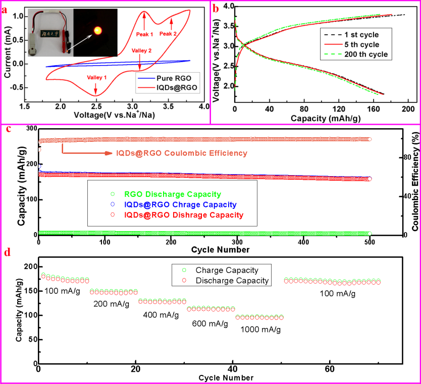 王斌博士通过大量的理论计算证明了碘是一种潜在的钠电池正极材料。针对碘在电解液中极易溶解的问题,课题组采用浓度梯度法制备了新型碘量子点石墨烯复合材料(碘量子点原位生长在还原氧化石墨烯中),利用石墨烯大的比表面积有效地抑制了碘溶解。实验表明,当电流密度为100 mA g-1,碘-钠电池的容量达到了171 mA h g-1,经过500次的循环充放电后容量未出现衰减。为了验证碘-钠电池的微观充放电机制,鲁兵安课题组通过对电池结构进行改装,利用原位拉曼和原位电镜表征了充放电过程中电解液成分及碘量子晶体结构的变化。同时通过对碘-钠电池的正/负极匹配及优化制备出基于碘量子点石墨烯复合材料与钠化纳米碳纤维薄膜的碘-钠全电池。研发的新型碘-钠全电池具有容量高、稳定性好等优点,是一种潜在的低成本的动力电池。