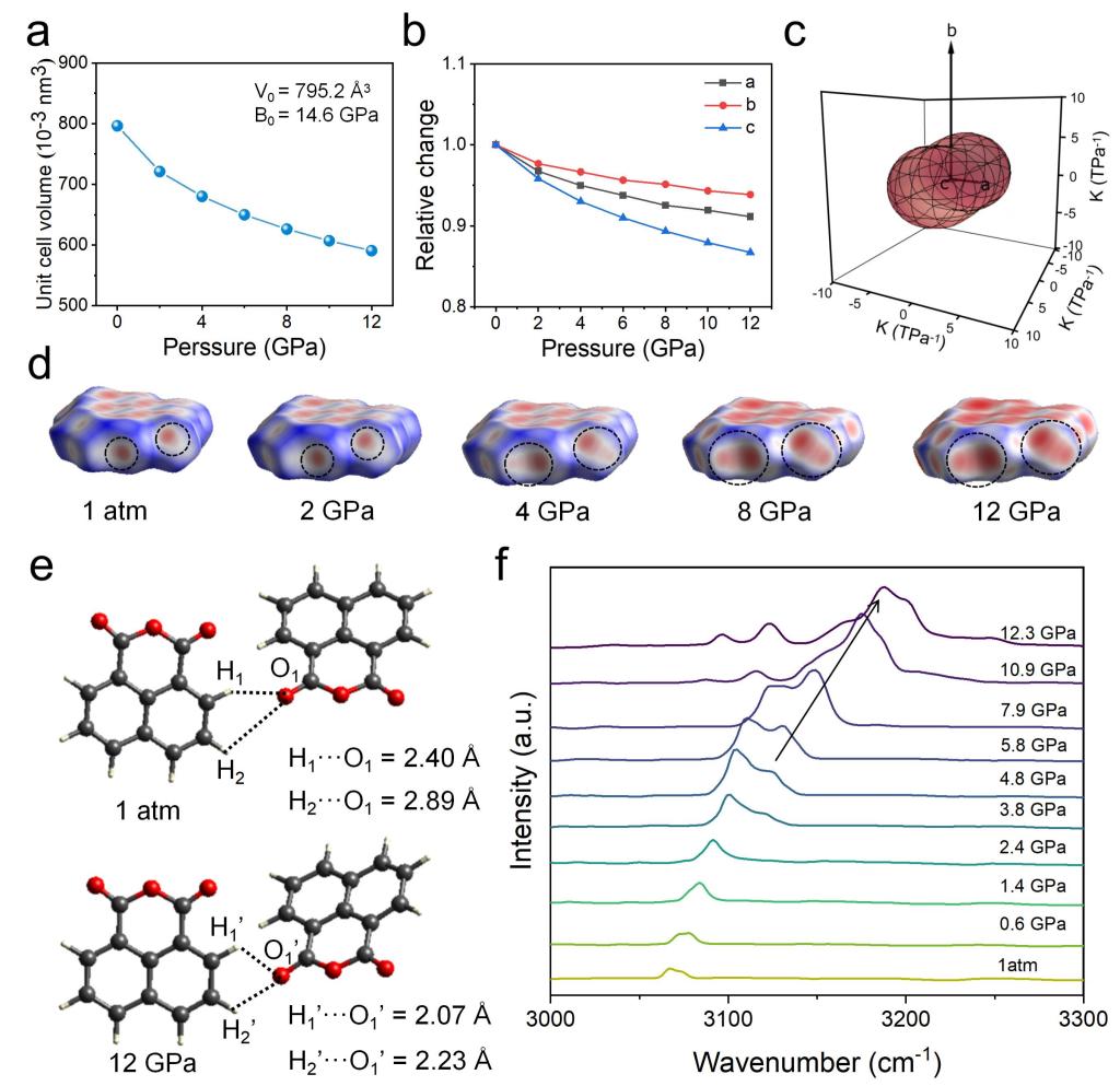 3. (a) 理论计算萘酐晶体晶胞体积在加压过程中的演变b萘酐晶体abc轴的相对压缩率c萘酐晶体abc方向的压缩性指标d不同压萘酐晶体分子的Hirshfeld表面e)在1 atm环境条件12 GPa萘酐晶体中氢键示意图f)不同压萘酐晶体30003300 cm-1红外吸收光谱。