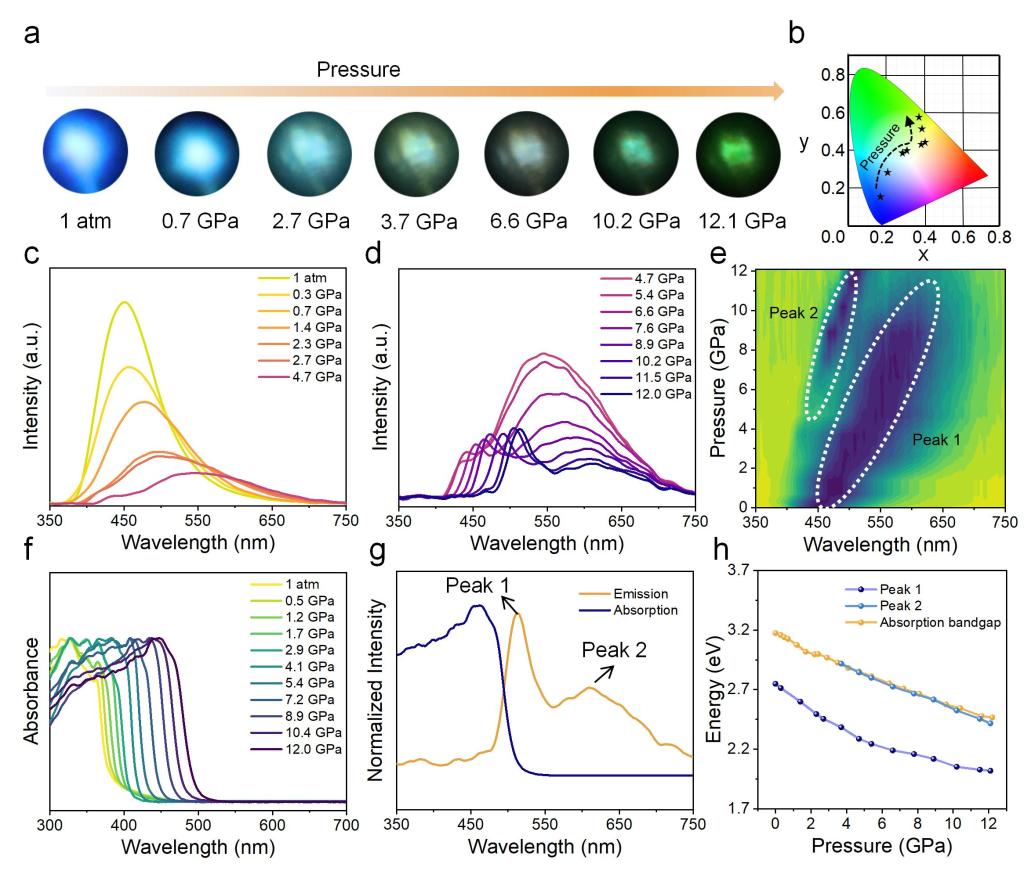 2. (a) 萘酐晶体在紫外光(λ = 355 nm)照射下的荧光照片b不同压萘酐晶体荧光发射的色位坐标cd不同萘酐晶体的荧光光谱e不同萘酐晶体的归一化二维伪彩色荧光发射图f不同萘酐晶体吸收光谱g12.0 GPa下的萘酐晶体吸收和发射光谱h)峰1和峰2的发射能及吸收带隙。